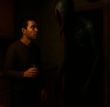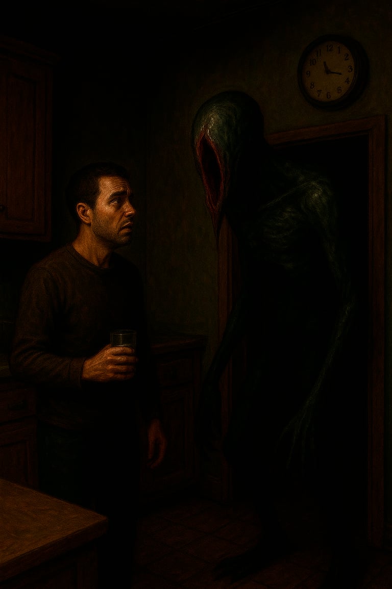 A pele brilhava, como se estivesse coberta de orvalho, e o que mais me aterrorizou foi a boca — ou o que parecia ser uma boca — aberta em silêncio, mas esticada até o peito, como se pudesse engolir o próprio escuro. Corri. Não rápido o bastante. O som dos passos dele é o pior de tudo, porque são lentos demais. Cada toc no chão me dizia que ele ainda estava vindo, sempre vindo.