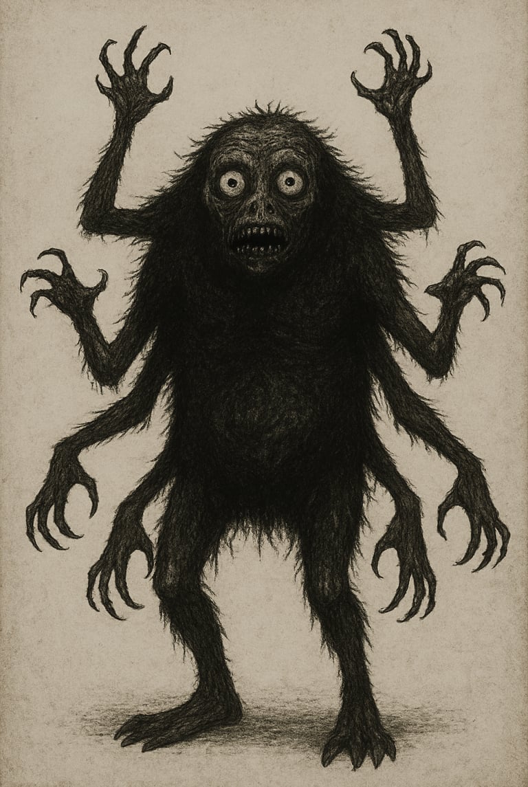Os lábios são finos e ressecados, mas se abrem em um sorriso que jamais revela dentes — apenas uma escuridão inquietante.