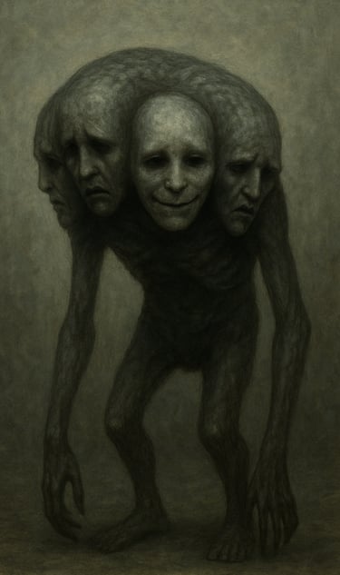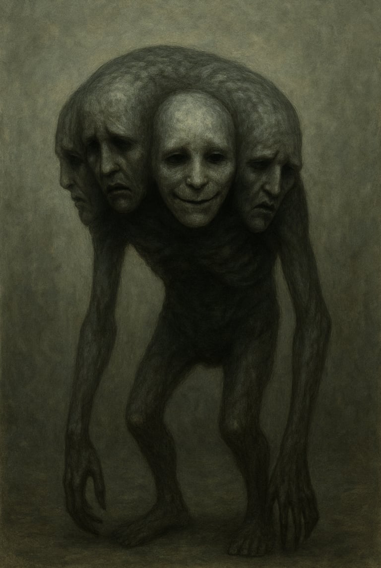 Às vezes, um filete de líquido escuro escorre dos olhos — não lágrimas, mas algo mais denso, como tinta.