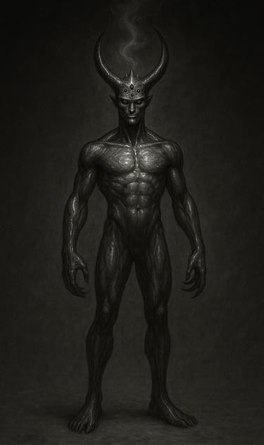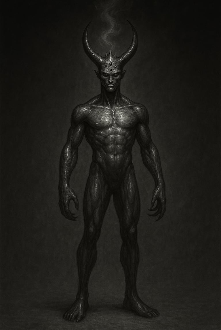 A pele lembra mármore rachado, com veios dourados que brilham levemente, refletindo a vaidade que o alimenta.
